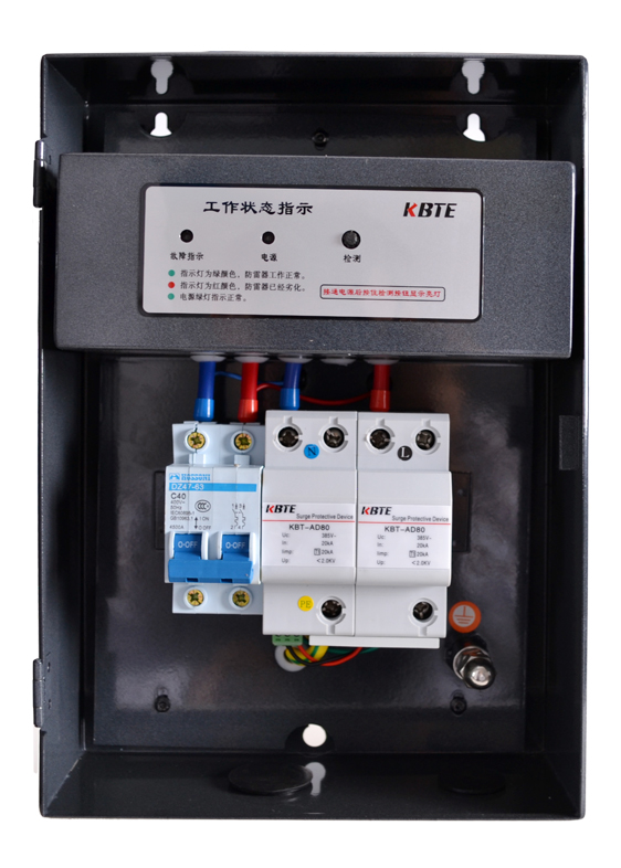 单相电源防雷箱内部安装的是符合GB18802.1-2011《低压电涌保护器(SPD) 第1部分 低压配电系统的保护器性能要求和试验方法》标准要求的电源防雷模块,其中KBT-AD系列配置的电源防雷模块为I级试验(T1)电涌保护器,用于第一级雷电防护,KBT-BD和KBT-CD系列配置的电源防雷模块为II级试验(T2)电涌保护器,分别用于第二级和第三级雷电防护。适合各种电网制式的单相电源系统,防止雷击产生的脉冲浪涌及瞬间过电压对用电设备造成损害。